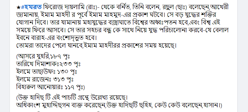হযরত ফিরোজ দায়লামী (রা:) থেকে বর্ণিত, তিনি বলেন, আখেরী জামানায় ইমাম মাহদীর পূর্বে ইমাম মাহমুদ এর প্রকাশ ঘটবে। সে বড় যুদ্ধের শক্তির যোগান দিবে। তাঁর জামানায় মহাযুদ্ধের (৩য় বিশ্বযুদ্ধে) বজ্রাঘাতে (আনবিক অস্ত্রে) বিশ্বের অধ্বঃপতন হবে এবং বিশ্ব এই সময়ে ফিরে আসবে (অর্থাৎ আধুনিকতা ধ্বংস হয়ে প্রাচীন যুগে ফিরবে)। সে তাঁর সহচর বন্ধুকে (সাহেবে কিরান শামীম বারাহকে) সাথে নিয়ে যুদ্ধ পরিচালনা করবে, যে বেলাল ইবনে রাবাহ-এর বংশোদ্ভুত হবে। তোমরা তাদের পেলে জানবে ইমাম মাহদীর প্রকাশের সময় হয়েছে।